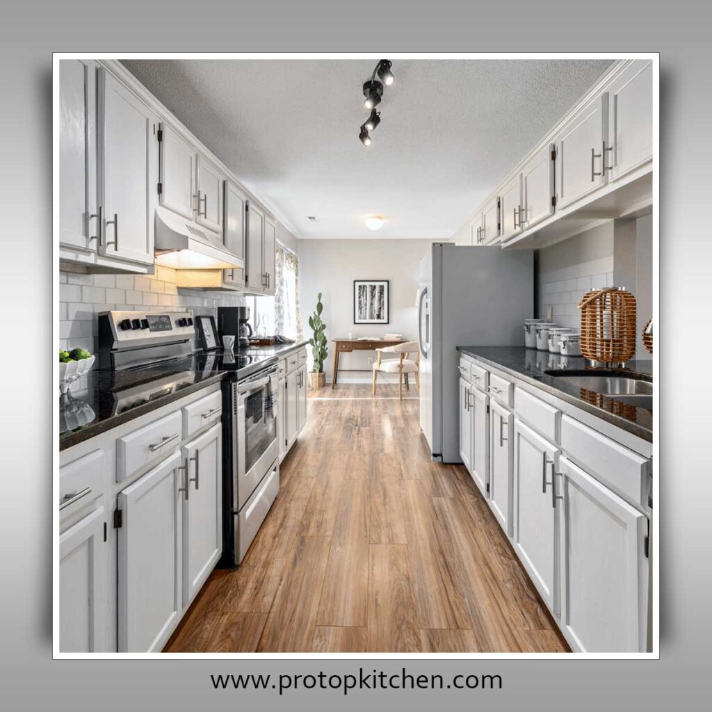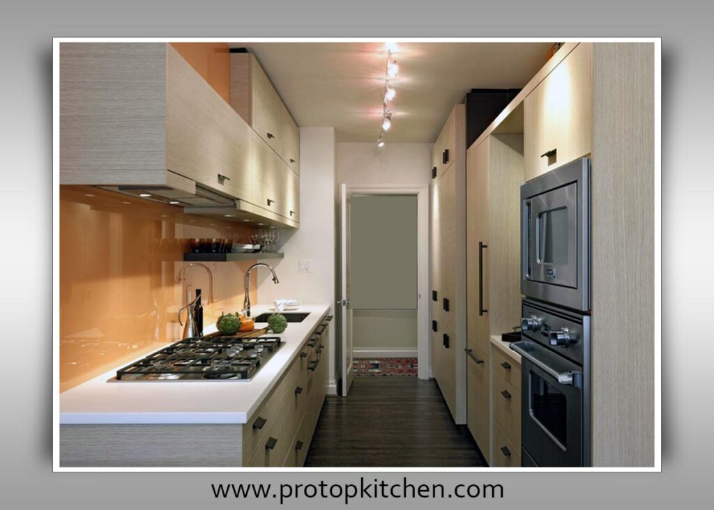 A galley kitchen layout features two parallel countertops and work areas along two walls, forming a corridor-like design.