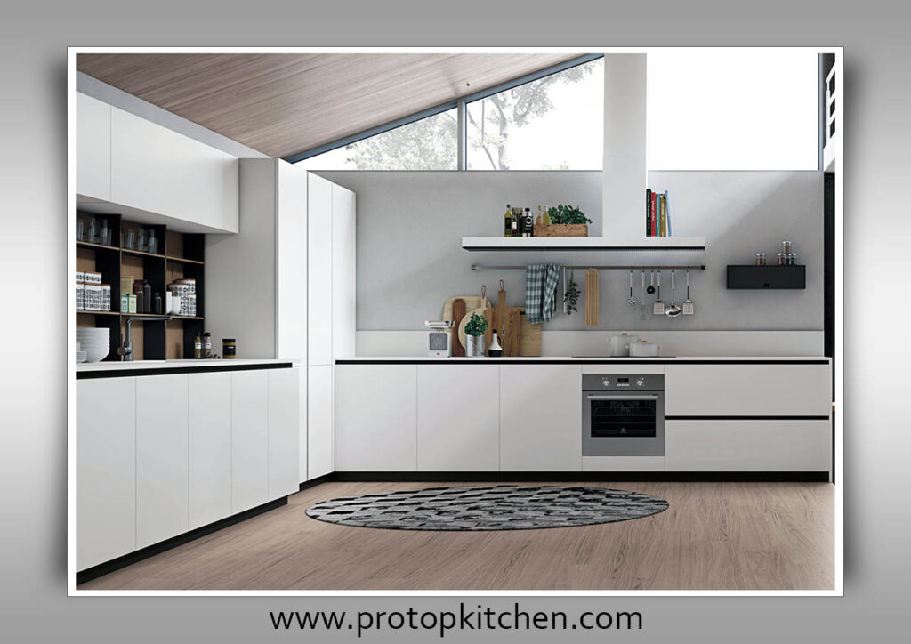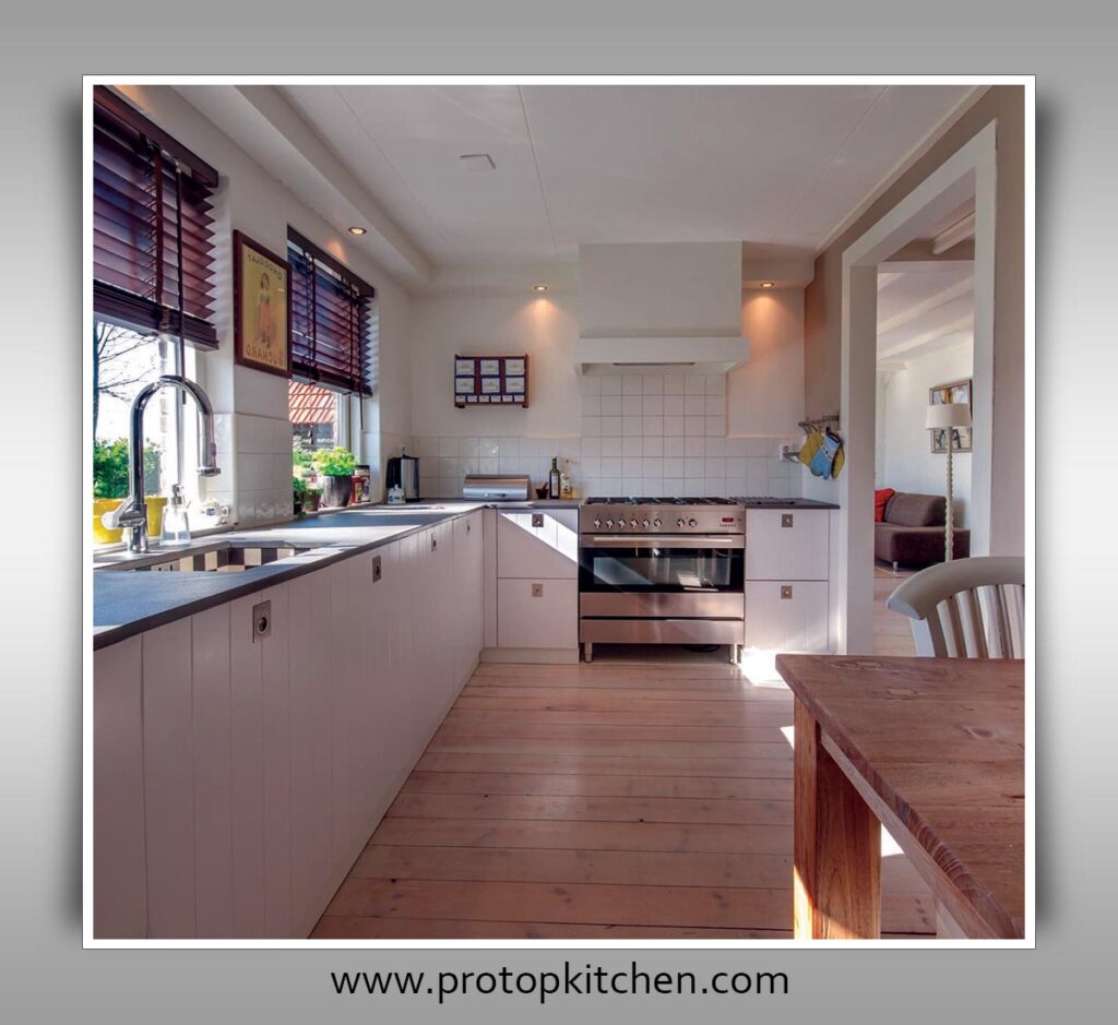 An L-shaped layout features countertops along two adjoining walls that form an “L” shape, creating an efficient work triangle.