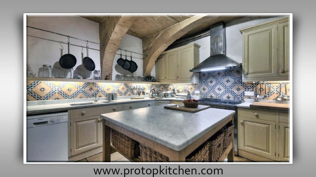 A rustic farmhouse kitchen embodies a blend of vintage charm and rustic elements, often featuring reclaimed wood, distressed finishes, and classic farmhouse fixtures.
