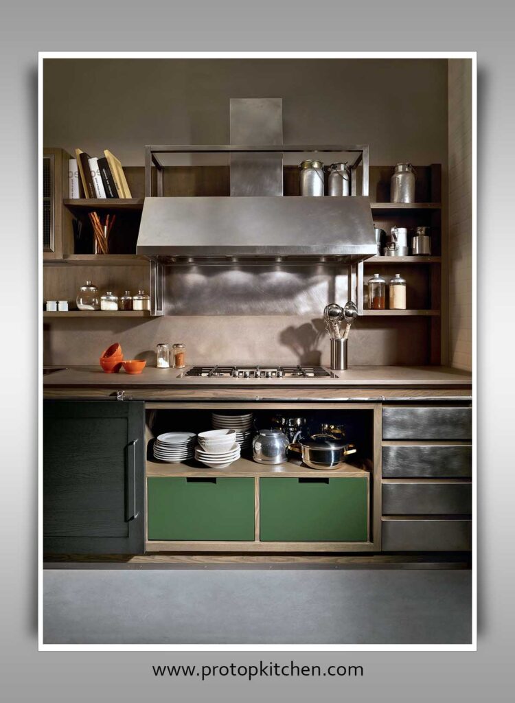 A vintage industrial kitchen combines rustic, weathered elements with industrial features, reminiscent of old factories and warehouses.